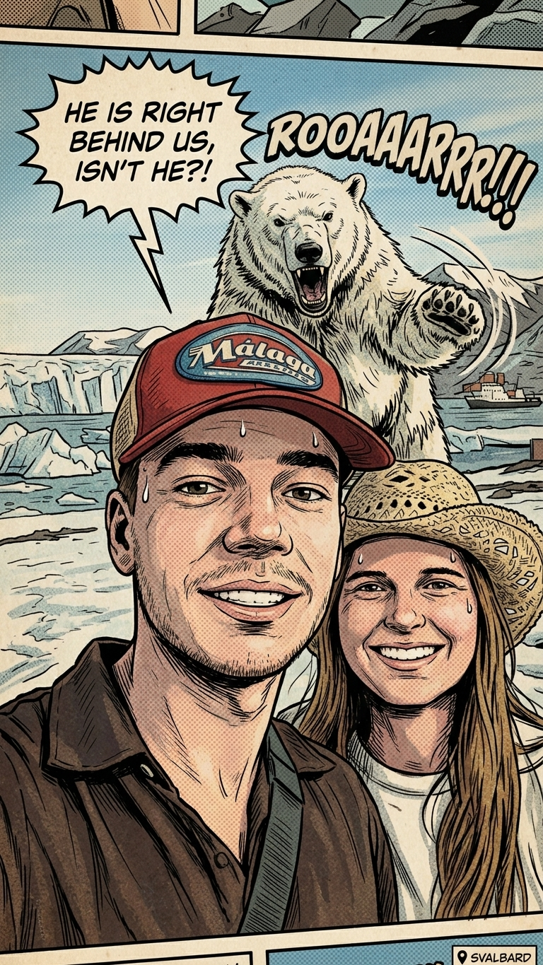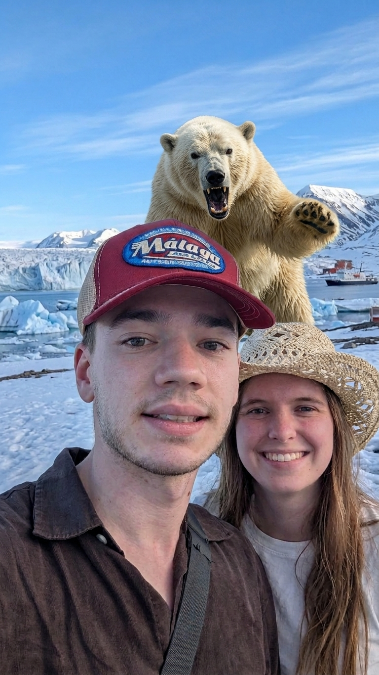 "Verander de achtergrond naar de noordpool en voeg een aanvallende ijsbeer toe."
